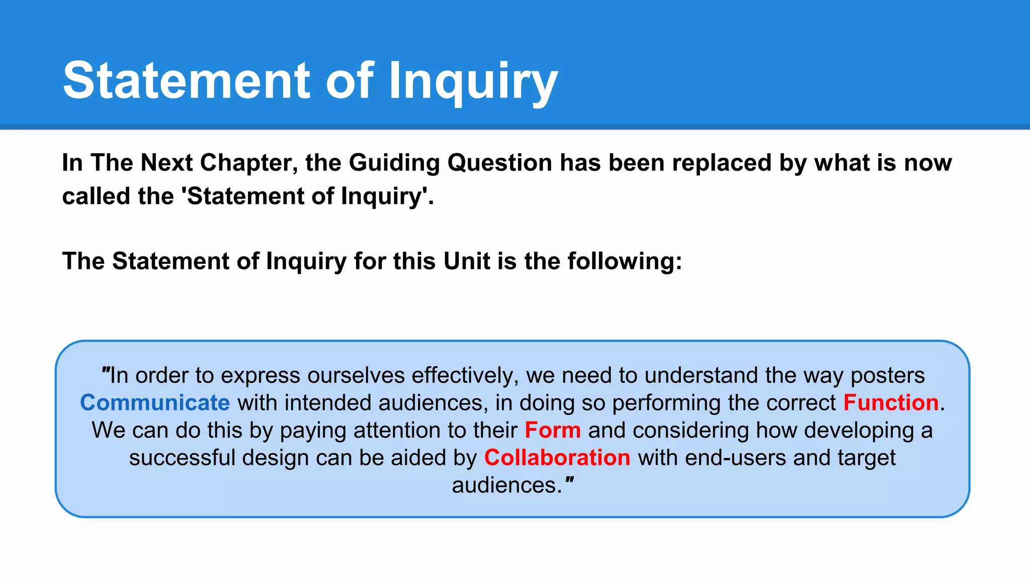 Students are required to create an effective poster advertisement to advertise an upcoming school event, International Evening in December, to their peers, families, and teachers. The poster must satisfy the end-users' (Miss Daykin and Miss Barton) requirements and convey the theme of the event through manipulation of form, which includes elements like images, text, shapes, and colors. To be successful, the poster must communicate important information to the target audience—the ISM community of students, parents, and teachers—through consideration of its function, form, and collaboration with end-users.