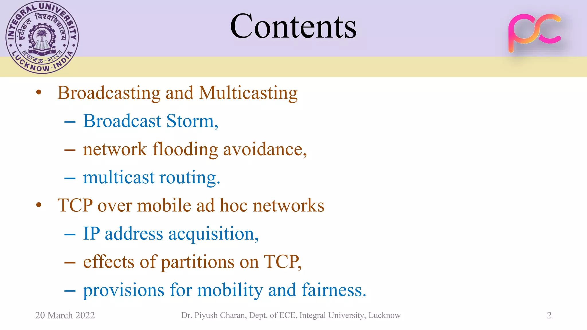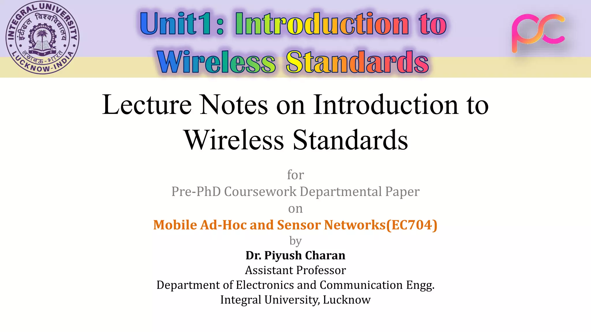 This document provides lecture notes on wireless standards for mobile ad-hoc and sensor networks. It covers topics such as broadcasting and multicasting, including issues like broadcast storms and network flooding avoidance. It also discusses TCP over mobile ad hoc networks, addressing challenges from mobility and network partitions. Additional sections cover wireless LAN specifications and protocols, Bluetooth specifications and operations, and casting techniques such as unicast, multicast and broadcast.