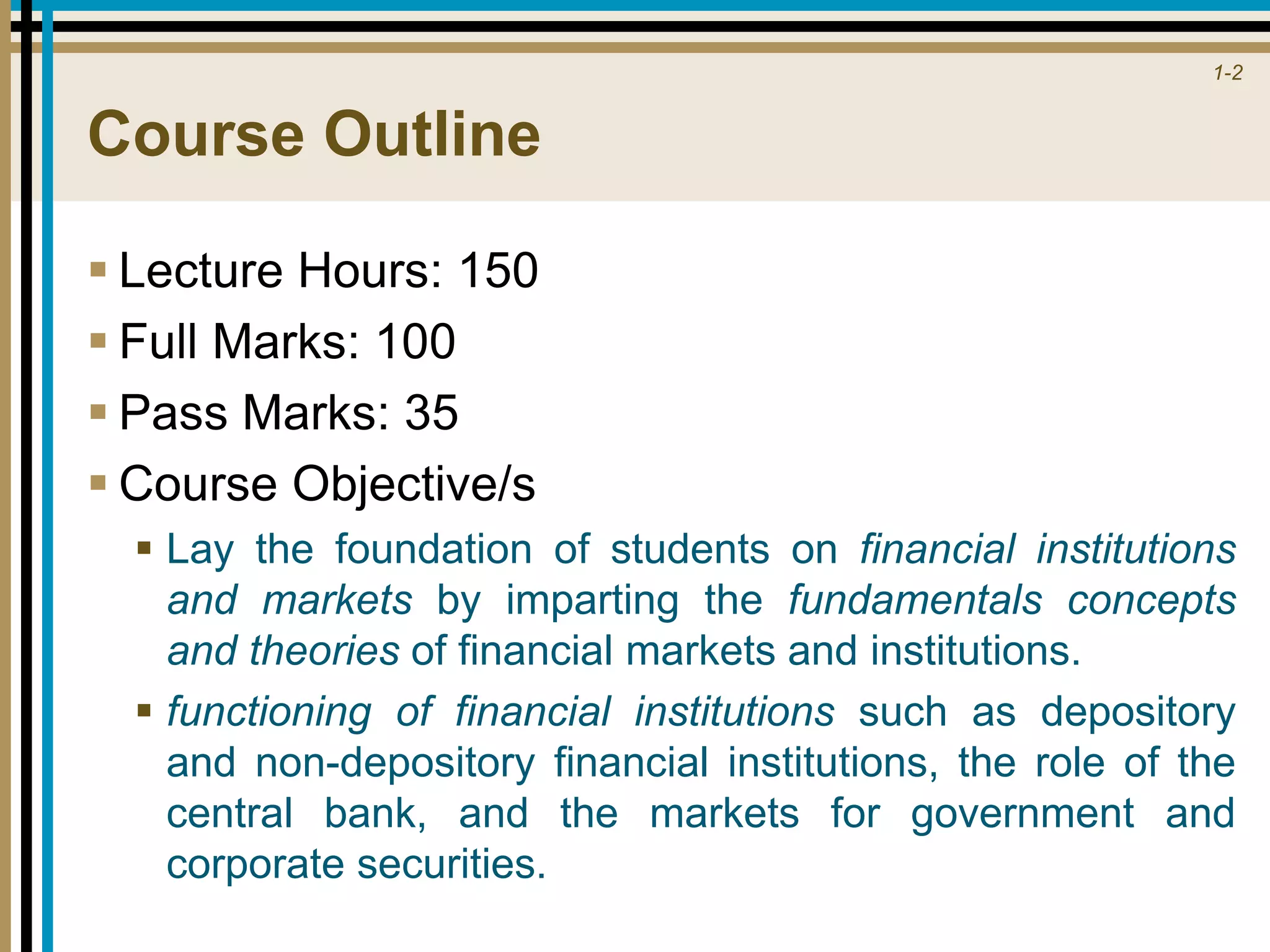 The document outlines a course on the foundations of financial markets and institutions, covering various topics such as financial assets, types of markets, and their economic functions. It includes detailed units on financial institutions, the role of government, market structures, risks associated with financial assets, and different asset classifications. Additionally, the document discusses globalization impacts, derivatives markets, and the importance of regulation in maintaining market integrity.