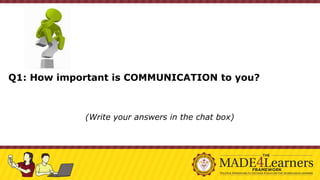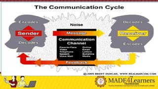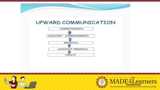 This document discusses communication in professional organizations. It defines communication and outlines its key characteristics, including that it involves a minimum of two people and is a two-way process. The document then describes the communication process, including the sender, message, encoding, channel, receiver, decoding, and feedback. It discusses different types of communication like verbal, nonverbal, and written. The document also examines formal and informal communication channels within organizations and how information flows vertically and horizontally through the organizational structure. It emphasizes the importance of professional communication for unity, professionalism, productivity, and peace/harmony within an organization.