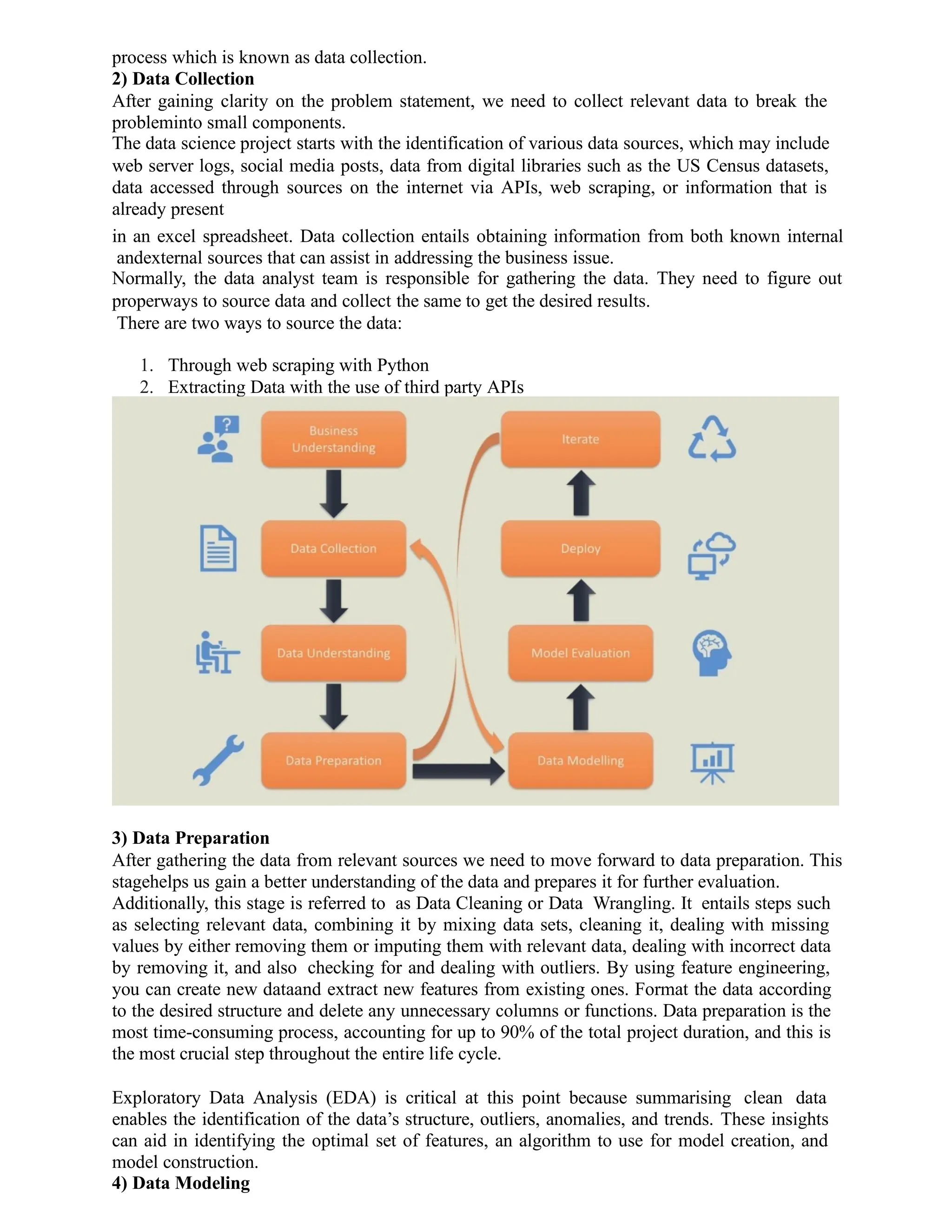The document outlines the data science project lifecycle, detailing each critical step including understanding the business problem, data collection, data preparation, data modeling, and model deployment. It emphasizes the roles of various team members like business analysts, data analysts, and data scientists in building effective data science projects, as well as the importance of rigorous testing and proper communication of results. Additionally, it introduces the OSEMN framework and highlights essential skills needed in data preprocessing and model interpretation.
