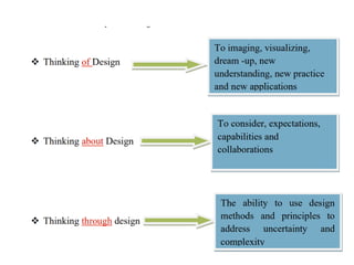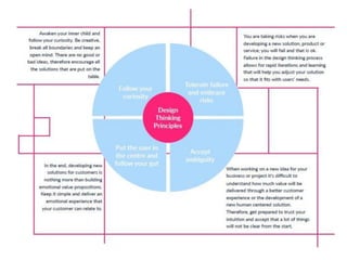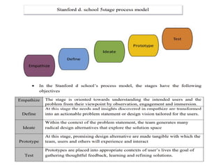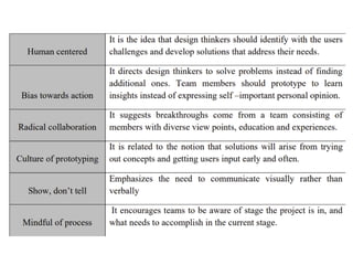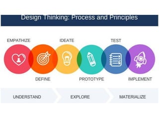 The document introduces design thinking as a human-centered problem-solving process consisting of five steps: empathize, define, ideate, prototype, and test. It emphasizes understanding user needs through empathy and observation to create successful and innovative solutions in various contexts. The text also provides exercises and examples to illustrate how to apply these principles, exemplifying their use in cake design.