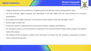 The document provides an overview of digital computer organization and architecture, covering key components such as hardware, software, the CPU, memory, and input/output devices. It explains data representation in binary formats, including fixed-point and floating-point representations, and outlines different methods for handling signed integers. Additionally, it discusses number systems including binary, decimal, octal, and hexadecimal, and conversion methods between these systems.