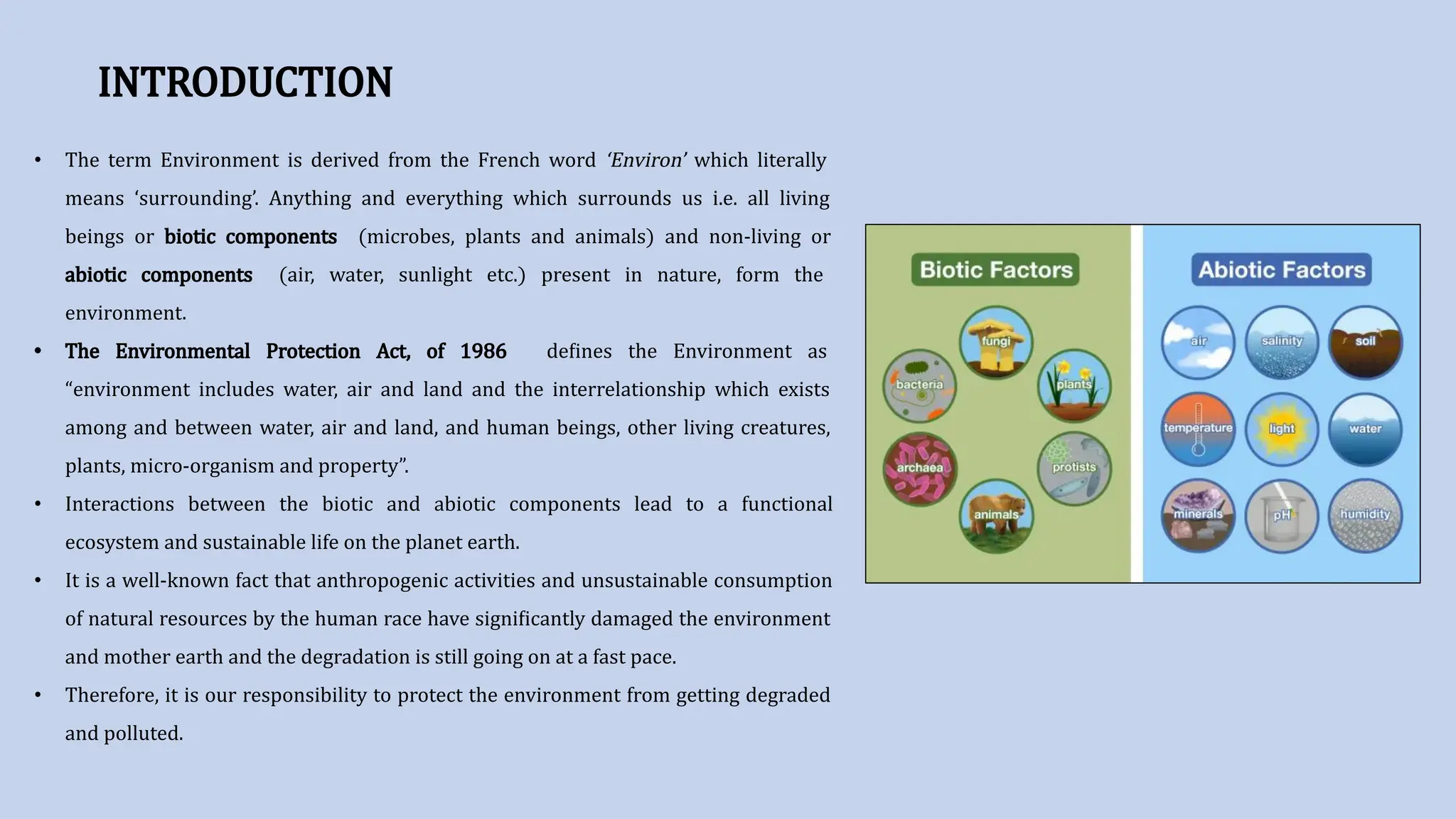 • The Environmental Protection Act, of 1986 defines the Environment as