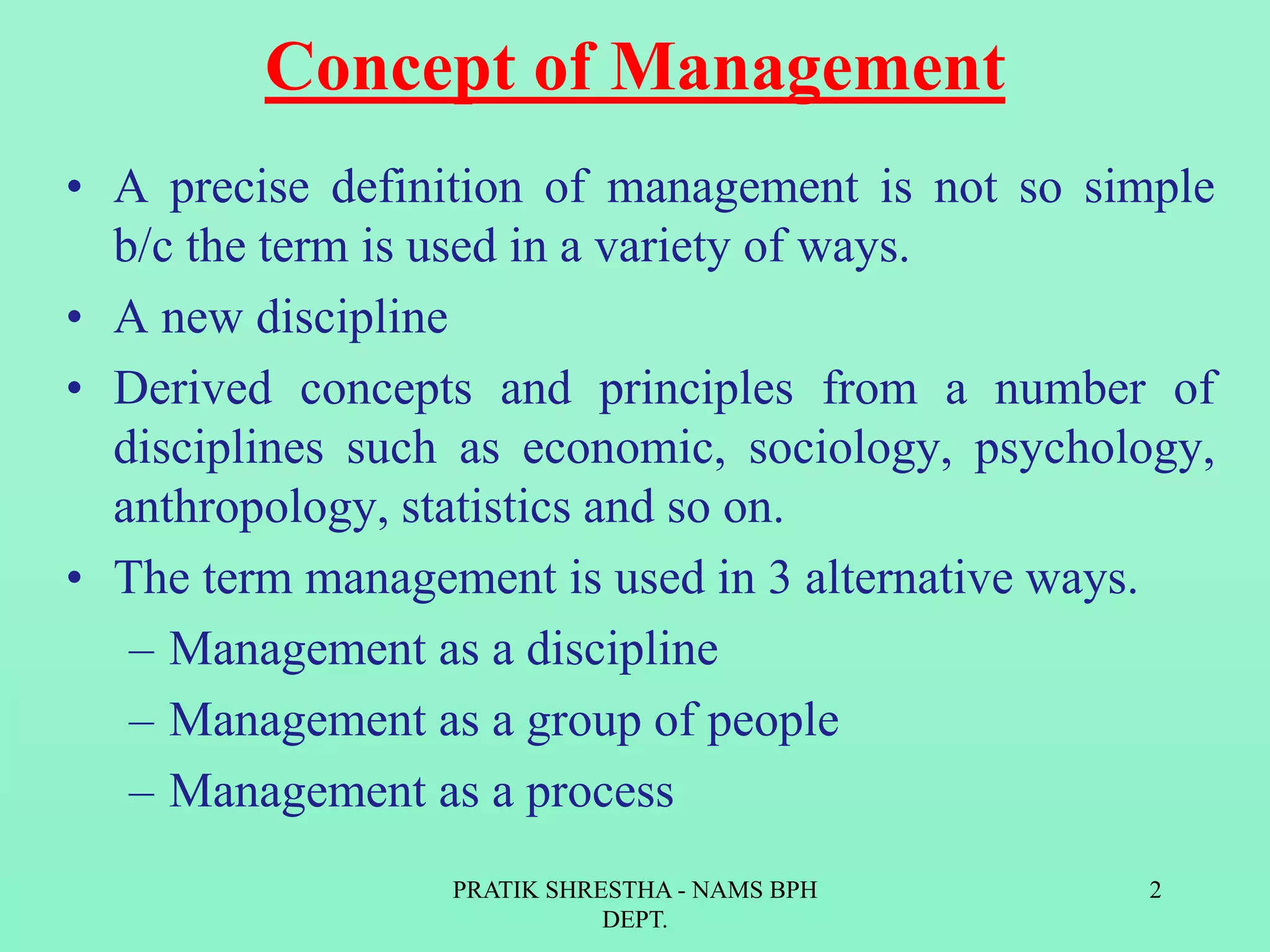 1. The document discusses various concepts and principles of management and public health administration. It defines management from different perspectives such as production oriented, people oriented, and decision making oriented views.