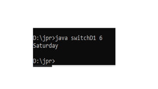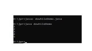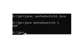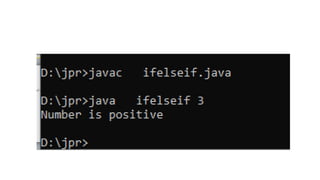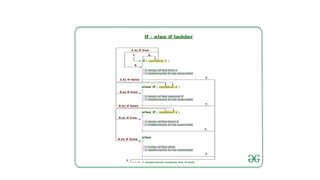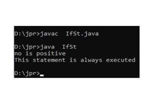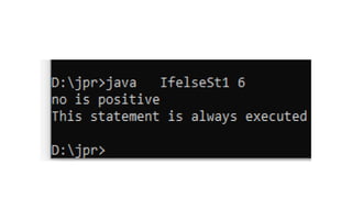 This document provides an overview of various decision-making constructs in Java, including if statements, if-else statements, nested if-else, if-else-if ladders, loops (while, do-while, for), and switch statements. Each construct is explained with its syntax and example code demonstrating its use. Additionally, it covers break and continue statements, return statements, and the ternary conditional operator.