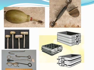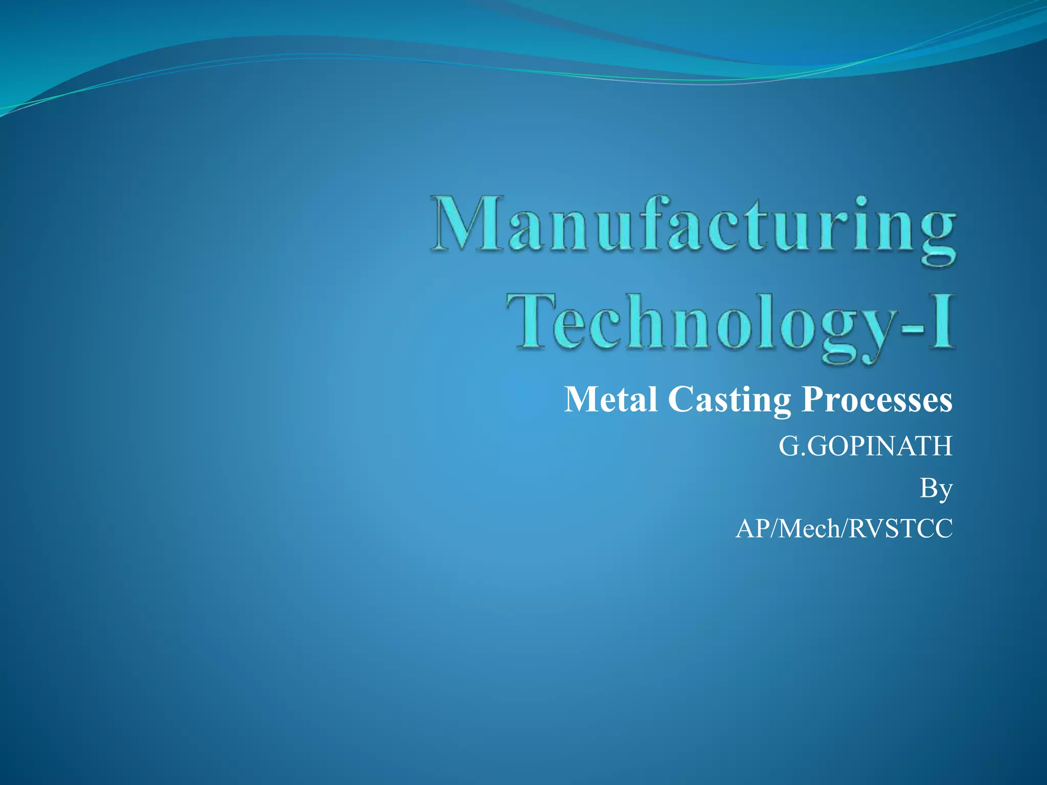 This document discusses various metal casting processes and techniques. It covers topics like sand casting, pattern making, molding sand properties, core making, and casting defects. Sand casting involves pouring molten metal into an expandable sand mold and allowing it to solidify. Different types of sand and patterns are used depending on the application. Properties of molding sand like permeability and strength are important. Cores are used to create internal cavities and angles in castings.