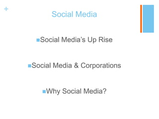 The document discusses the rise of social media and its benefits for corporations. It notes that social media platforms like MySpace emerged in 2000 and helped expand communication. The document recommends that businesses use social media to extend their audience, keep current customers updated, and reach more people for communication and advertising purposes.