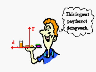1. The document discusses work, energy, and their relationship. It defines work as being done when a force causes an object to move in the direction of the force, displacing it.
