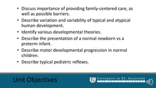Motor development in children follows a generally predictable sequence, progressing from primitive reflexes in newborns to independent walking and running by age 2. Variability within and between children is normal and allows for exploration, but atypical development may show less variability and delays in achieving milestones. The focus of intervention is to provide varied experiences that expand a child's motor strategies and skills based on their readiness.