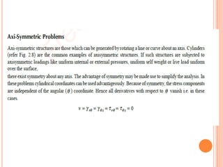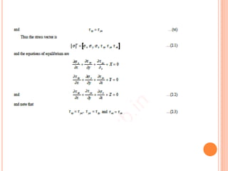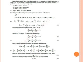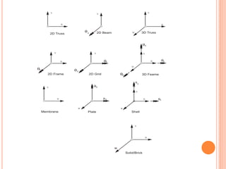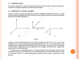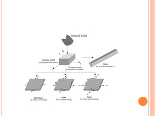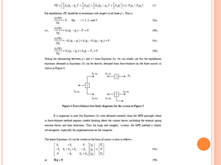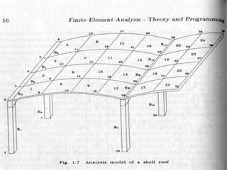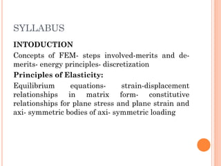 The document provides an introduction to the Finite Element Method (FEM). It discusses the history and development of FEM from the 1950s to the present. It outlines the basic concepts of FEM including discretization of the domain into finite elements connected at nodes, and the approximation of displacements within each element. The document also discusses minimum potential energy theory, which is the variational principle that FEM is based on. Example problems and a tutorial are mentioned. Advantages of FEM include its ability to model complex geometries and loading, while disadvantages include increased computational time and memory requirements compared to other methods.