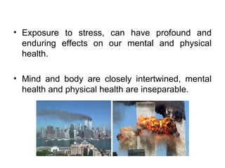 Exposure to stress can have significant negative impacts on both mental and physical health. Prolonged or chronic stress can weaken the immune system over time and increase risks of illnesses. Health psychologists study the relationships between psychological factors like stress and the body's systems. While short-term stress can stimulate aspects like creativity, long-term stress is generally harmful and can lead to issues like adjustment disorders or post-traumatic stress disorder. Managing stress through techniques such as exercise, social support, and relaxation can help reduce risks to health.