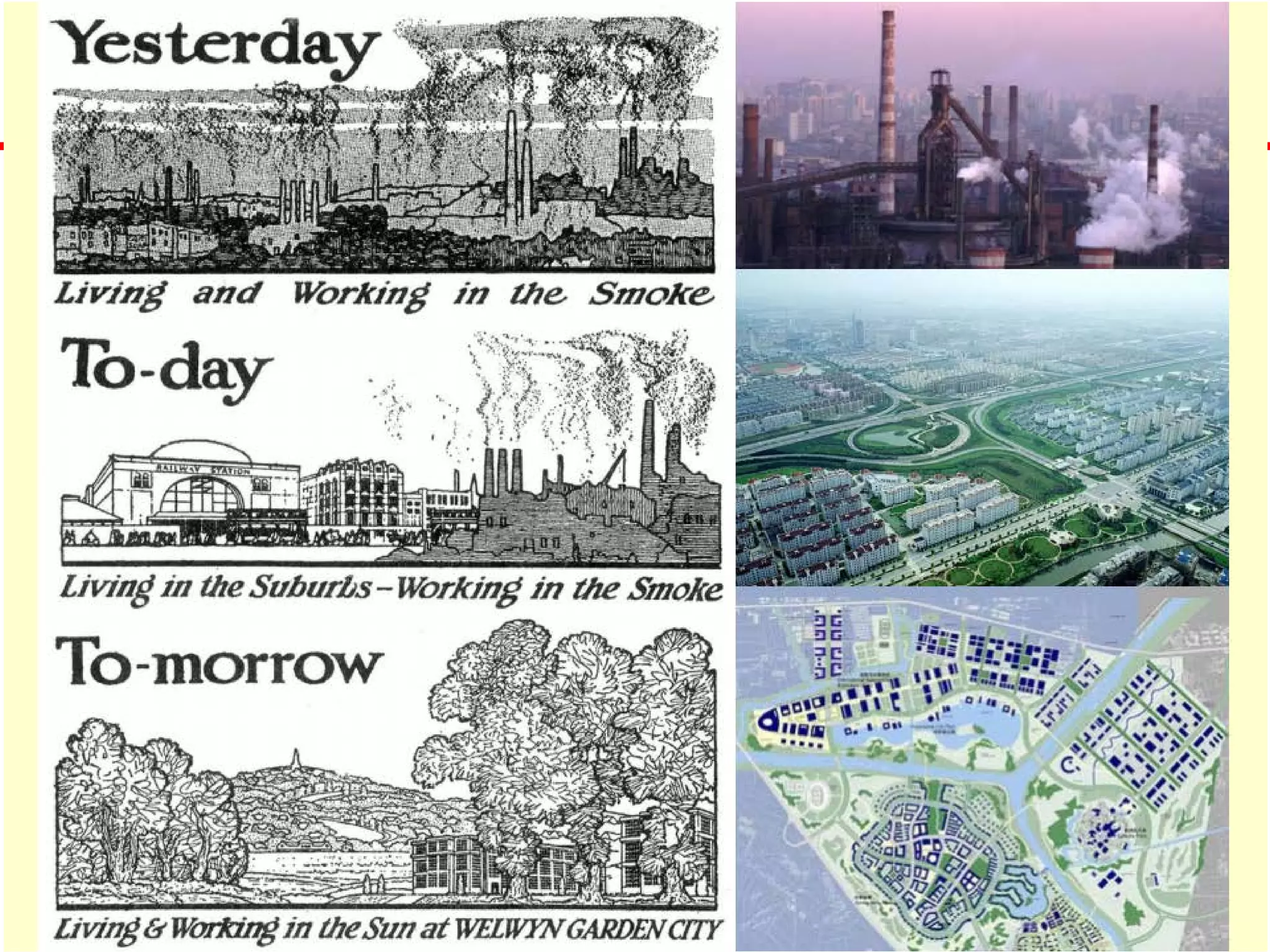 1) The Garden City concept introduced by Ebenezer Howard, which proposed self-contained communities that blend the advantages of urban and rural living. This influential model was applied in various "Garden Cities" developed in the early 20th century.