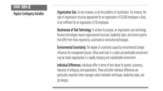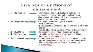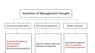 This document provides an overview of classical management theories including scientific management, bureaucracy, and general administrative theory. It discusses the key contributors and principles of each approach. Scientific management, developed by Frederick Taylor, emphasized increasing efficiency through dividing work into tasks, implementing incentive pay, and adopting a scientific approach. Max Weber's bureaucracy theory described an ideal type of organization with division of labor, hierarchy, rules, and impersonal relationships. Henri Fayol's general administrative theory identified functions of management as planning, organizing, commanding, coordinating and controlling. While providing a foundation for modern management, the classical theories took a narrow view of organizations and overemphasized economic rewards and rules. However, some of their techniques related to work analysis and productivity improvements