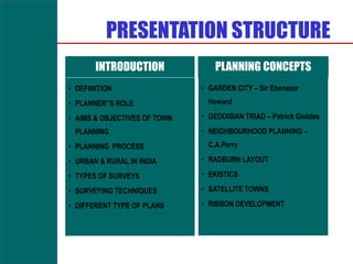 This document provides an introduction to town planning and planning concepts. It defines town planning as the art and science of ordering land use and infrastructure development to achieve the maximum degree of economic, social and environmental benefits. The document outlines the role of planners, aims of town planning like creating healthy, convenient and beautiful environments, and the typical planning process including data collection, analysis, plan making and implementation. It also describes different types of surveys and plans used in urban planning.