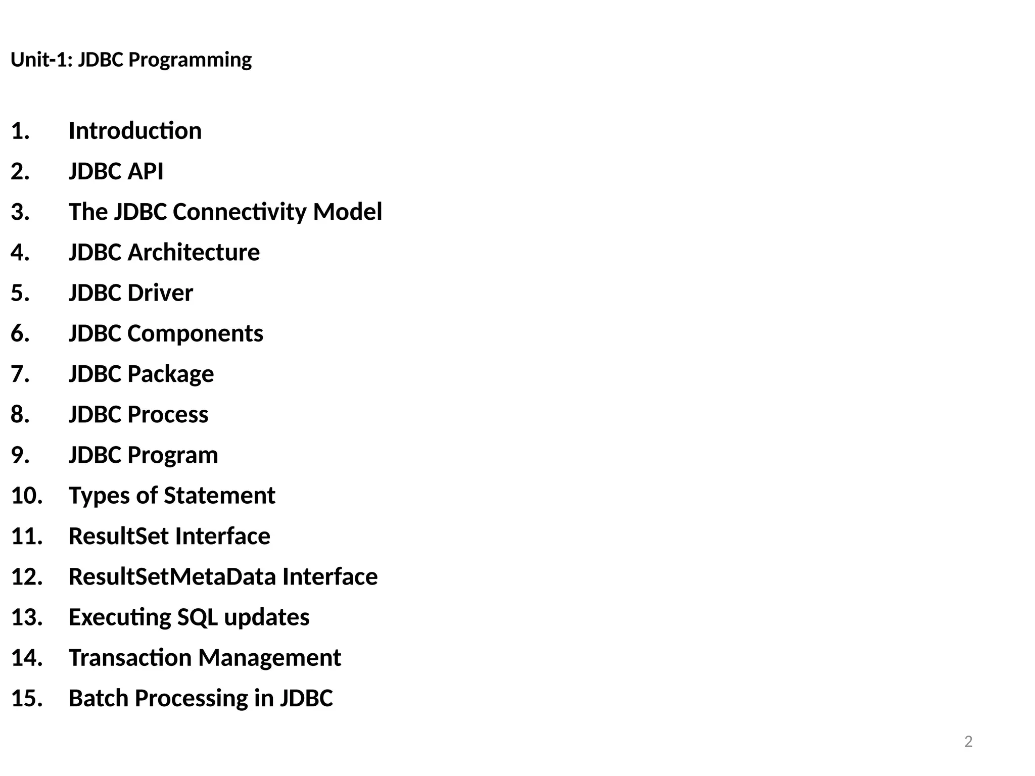 The document provides an extensive overview of JDBC (Java Database Connectivity), an API for connecting Java applications to various databases in a platform-independent manner. It covers the JDBC architecture, different types of JDBC drivers (Type 1 through Type 4), their advantages and disadvantages, and the overall JDBC programming process. Additionally, it includes examples of database connectivity and practical considerations for choosing appropriate JDBC drivers for different scenarios.