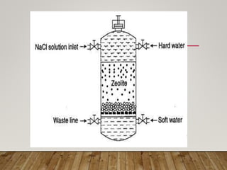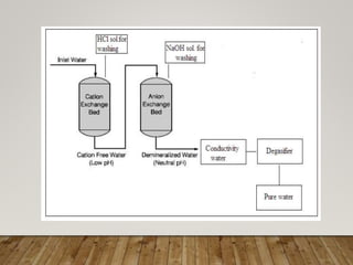 This document discusses various impurities found in water and their removal methods. It describes suspended, colloidal, dissolved, and biological impurities and filtration, coagulation, chemical treatment, and sterilization methods. It also discusses hardness in water, including temporary and permanent hardness and their removal by boiling or other chemical methods. EDTA titration and alkalinity determination methods are outlined. Issues caused by hard water in boilers like corrosion, priming, foaming, sludge, scale, and caustic embrittlement are summarized along with their prevention.