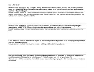 The document discusses research methods for creating new media products. It explains that research is important to understand if a target audience will buy a product, how much it can be sold for, and how to make it more appealing. It defines four research methods: primary research uses original, unedited materials; secondary research uses existing discussions for products like news; quantitative research uses surveys to gather business information; qualitative research gathers data on people's behaviors. The document then asks questions about the research methods used for assignments in year 10, how information was stored, and research techniques employed. It acknowledges mostly using secondary research from online articles and videos, and would use more varied methods if redoing the projects.