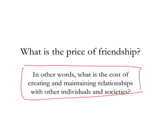 The document discusses the costs associated with creating and maintaining friendships and relationships between individuals and societies. It questions what price must be paid for friendship and how understanding this can help us better comprehend societies. Categorizing people and judging them by social roles can cause problems but may be convenient or socially expected.