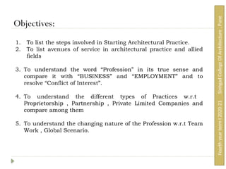 1. To listthe steps involved in Starting Architectural Practice.