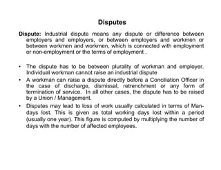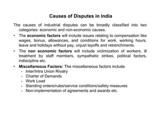 - Industrial disputes refer to conflicts between employers and employees regarding employment terms. They can arise from economic issues like wages or non-economic issues like poor treatment.