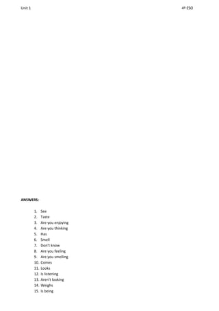 The document summarizes the differences between stative verbs and action verbs. It provides examples of common stative verbs like see, hear, feel, taste, think, believe, and be. While these verbs usually don't have continuous forms, some stative verbs can have continuous forms but with a difference in meaning compared to the simple form. It then provides a chart contrasting the simple and continuous forms of example stative verbs and their differences in implied meaning. Following this is a short quiz checking understanding of when certain verbs take simple or continuous forms.