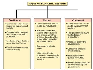 The document provides an overview of basic economic principles including scarcity, factors of production, and different economic systems. It discusses how individuals and societies make choices to deal with limited resources. Market economies answer the three basic economic questions through supply and demand interactions in product and factor markets, as depicted in the circular flow model. The US has a mixed economy that incorporates aspects of both market and command systems.