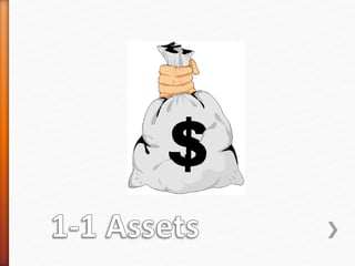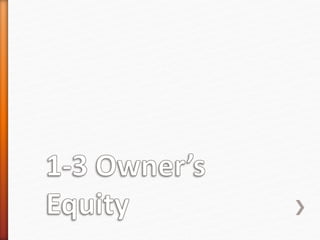 The document discusses key accounting concepts including the accounting equation, assets, liabilities, and owner's equity. It explains that the accounting equation - assets = liabilities + owner's equity - must always balance due to the double-entry bookkeeping method where every transaction affects a minimum of two accounts. Examples are provided to illustrate how various business transactions impact the components of the accounting equation by increasing or decreasing accounts.
