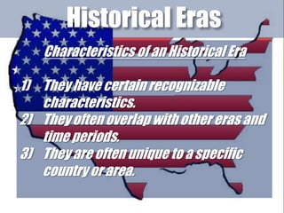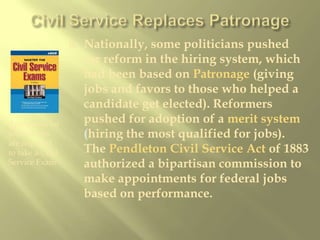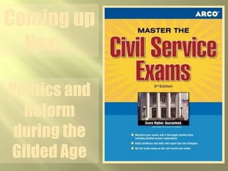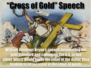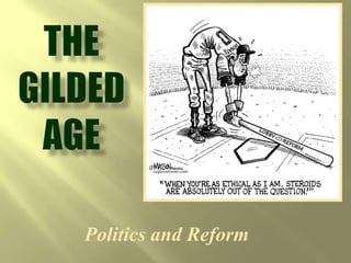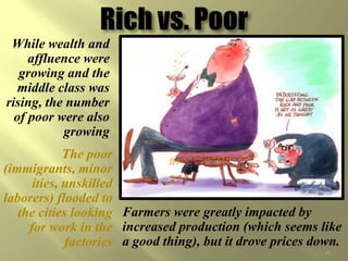 The document provides an overview of the Gilded Age in United States history from the 1870s to 1900. It describes how the era earned its name, as the country experienced rapid industrialization and economic growth alongside high levels of poverty and corruption. Key aspects of the Gilded Age discussed include the rise of large industrialists, growing inequality between the wealthy and poor, immigration and urbanization, as well as the policies that enabled unchecked industrial expansion.
