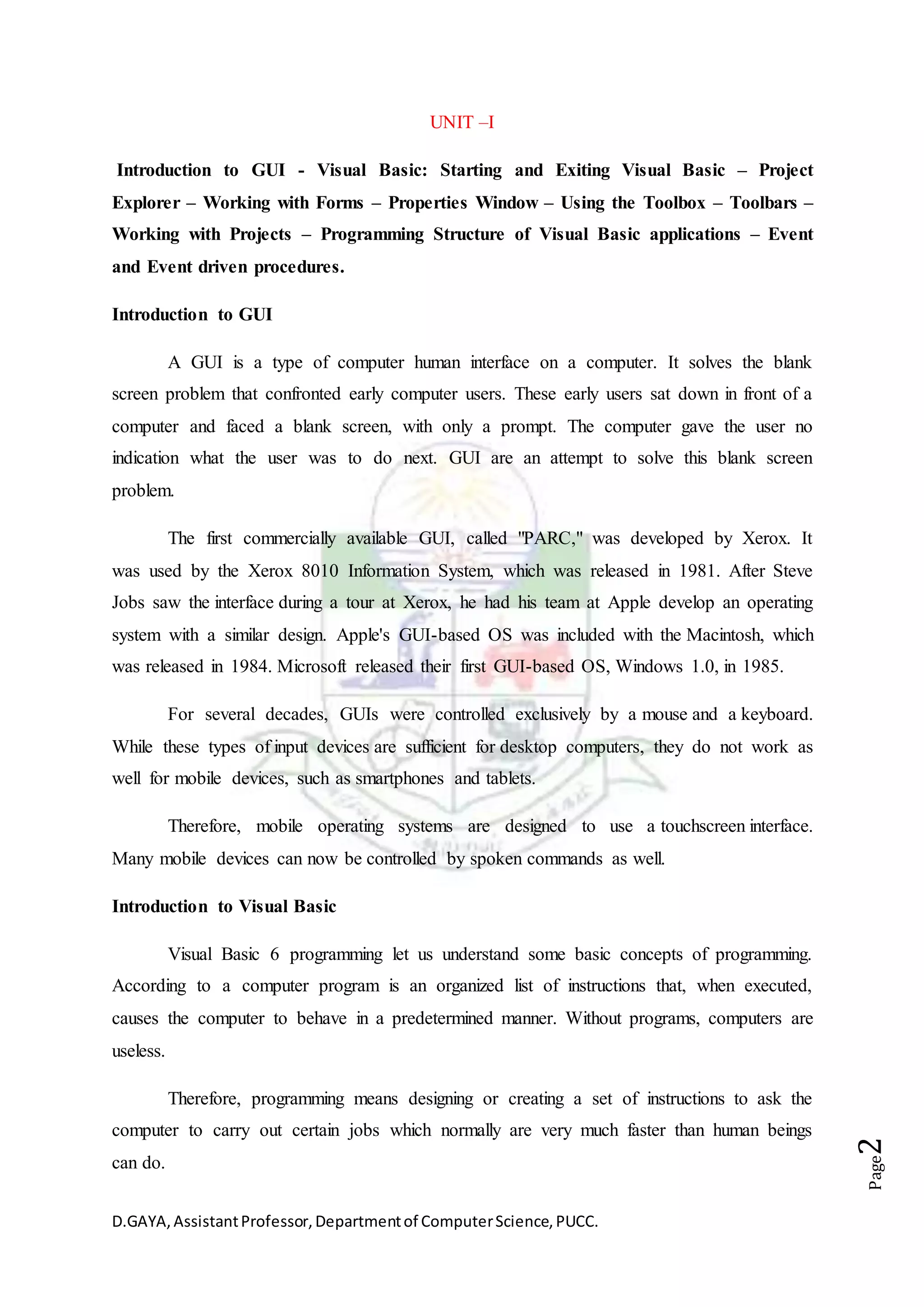 This document provides an introduction and overview of Visual Basic programming. It discusses what a GUI is and the history of GUI development. It then defines Visual Basic and discusses its advantages over earlier versions of BASIC. The document outlines some of the types of programs that can be created with Visual Basic 6 and describes the main components of the Visual Basic integrated development environment, including the toolbox, form, project explorer, and properties window. It provides guidance on starting a new Visual Basic project, saving the project, and exiting Visual Basic.