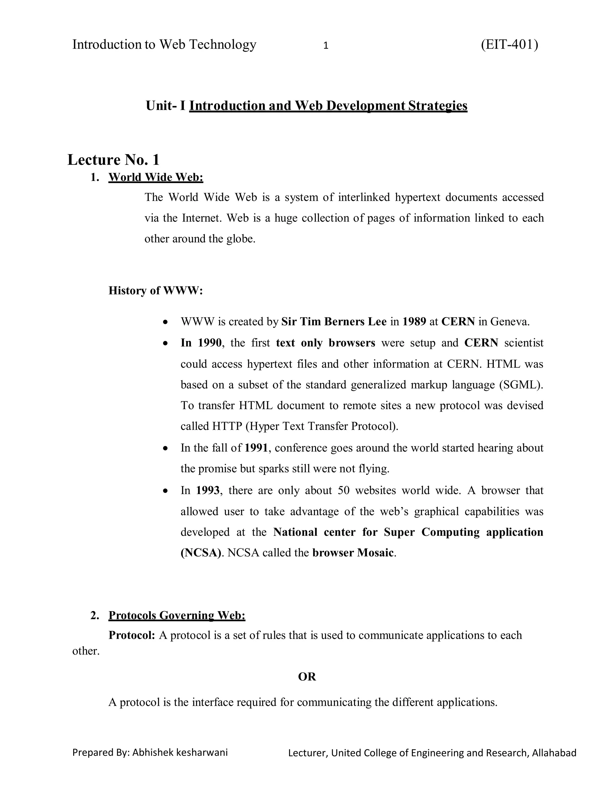 The World Wide Web was created by Tim Berners-Lee in 1989 and allows for hyperlinked documents accessed over the Internet using protocols like HTTP. Common web technologies include HTML for content, HTTP for transmission, and protocols like TCP/IP, FTP, SMTP, and Telnet. Developing a website requires planning such as identifying target users, determining objectives and scope, and assembling a team with the necessary skills across areas like design, programming, and quality assurance.