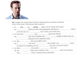 The document compares and contrasts the simple present and present continuous tenses. It provides examples of verb forms, exceptions, and guidelines for using each tense properly based on whether an action is habitual or ongoing. Key uses of the simple present are for general truths and routines, while the present continuous is used for temporary situations and actions happening now. Certain verbs like believe and know are usually only used in simple present form.