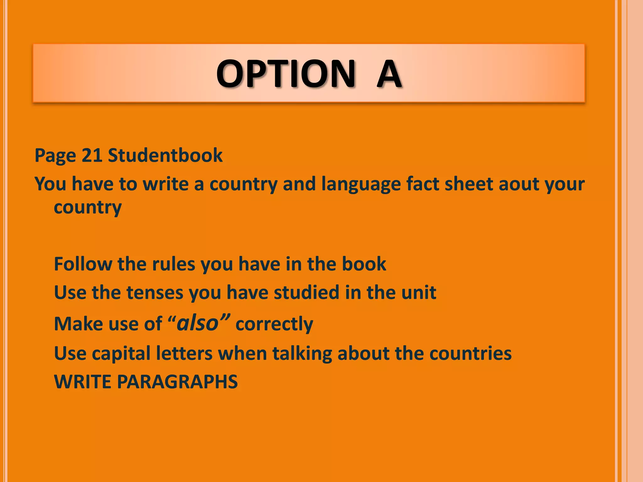 The document provides three writing options for students to choose from for an assignment. Option A involves writing a country and language fact sheet, following specific rules. Option B is to create an original horror story or adapt an existing story, incorporating common horror elements. The document also shares the folktale of Jack-O-Lantern, describing how the miser Jack, after dying, was turned away from both Heaven and Hell and forced to wander with only a lantern, leading to the Halloween tradition of carving pumpkins into jack-o-lanterns.