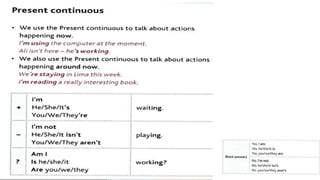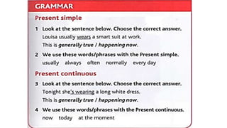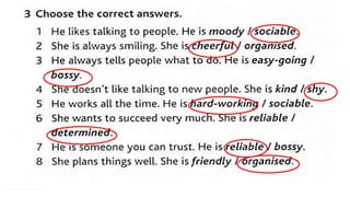 The document lists various items of clothing such as trousers, baseball caps, shirts, suits, jeans, dresses, shorts, jumpers, skirts, trainers, ties, sunglasses, and jackets. It also lists personality traits like bossy, cheerful, confident, determined, easy-going, friendly, hard-working, kind, moody, organised, reliable, shy, and sociable. Finally, it discusses verbs like watching, playing, waiting, working, and wearing in their present tense forms.