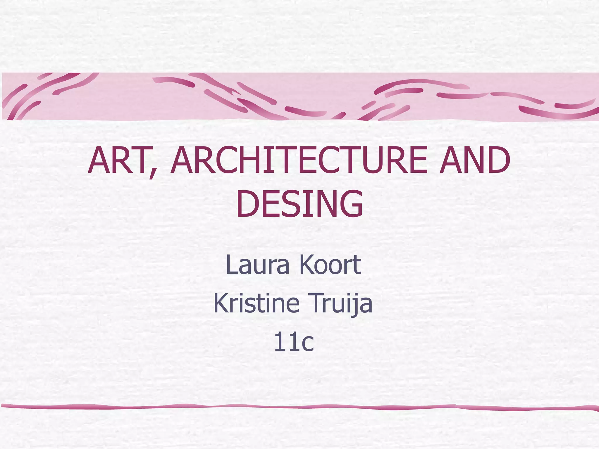 The document provides an overview of the history of art, architecture, and design in England from ancient times to the present day. It discusses important styles, movements, and notable figures that have influenced architecture, painting, sculpture, and other art forms throughout the centuries. Some of the key periods and developments mentioned include Stonehenge, medieval churches and castles, Gothic cathedrals, Palladian and Baroque styles in the 17th-18th centuries, landscape painting in the 19th century, and modern architecture in the 20th century.