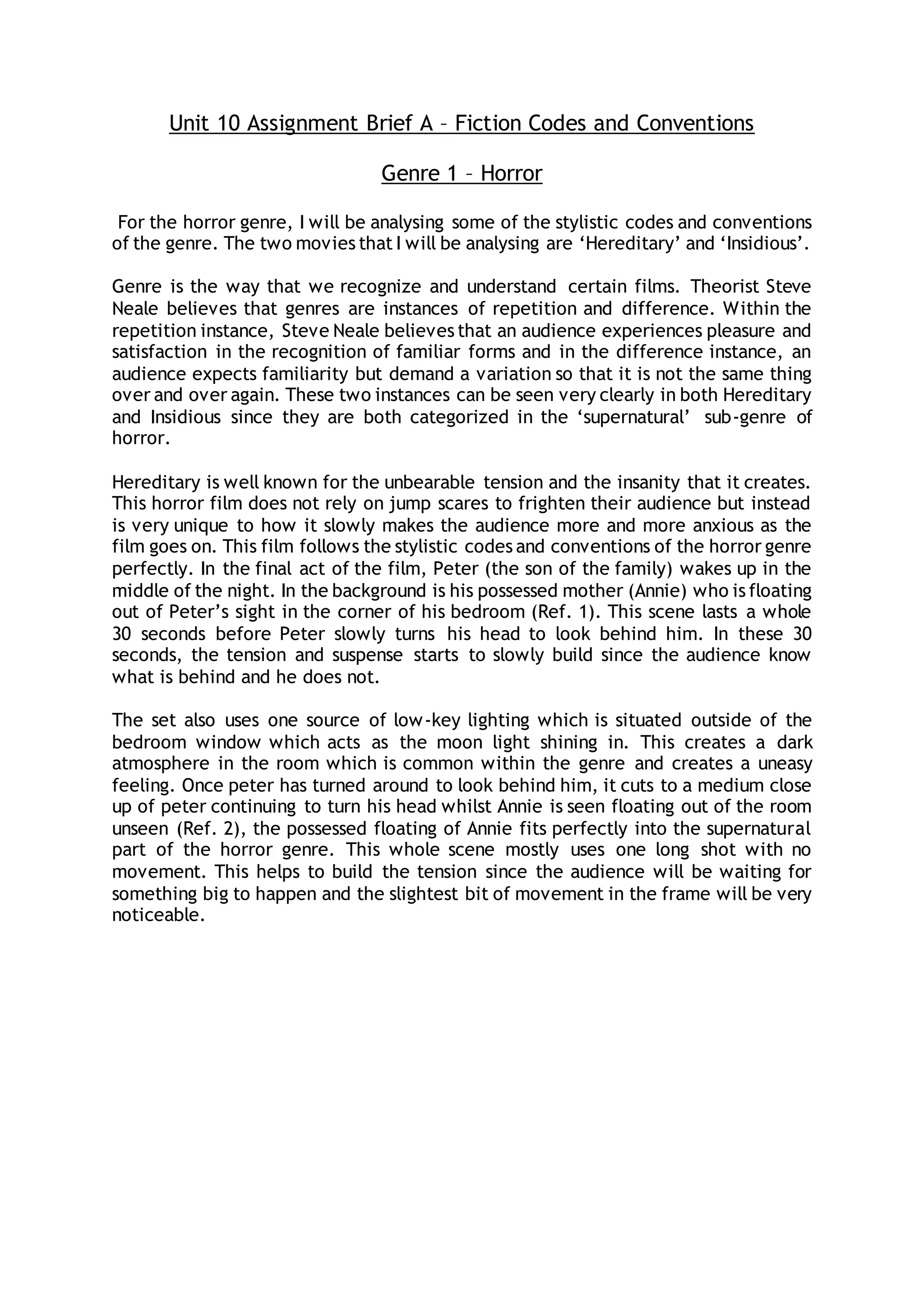 The document provides an analysis of codes and conventions in the horror and action genres using the films Hereditary, Insidious, John Wick, and Baby Driver as examples. It discusses how these films employ stylistic techniques like lighting, camerawork, sound, and props to create tension, build suspense, and intensify action sequences. It also examines how the films follow typical narrative structures involving an initial equilibrium that is disrupted, leading to attempts to repair the damage and achieve a new resolution.