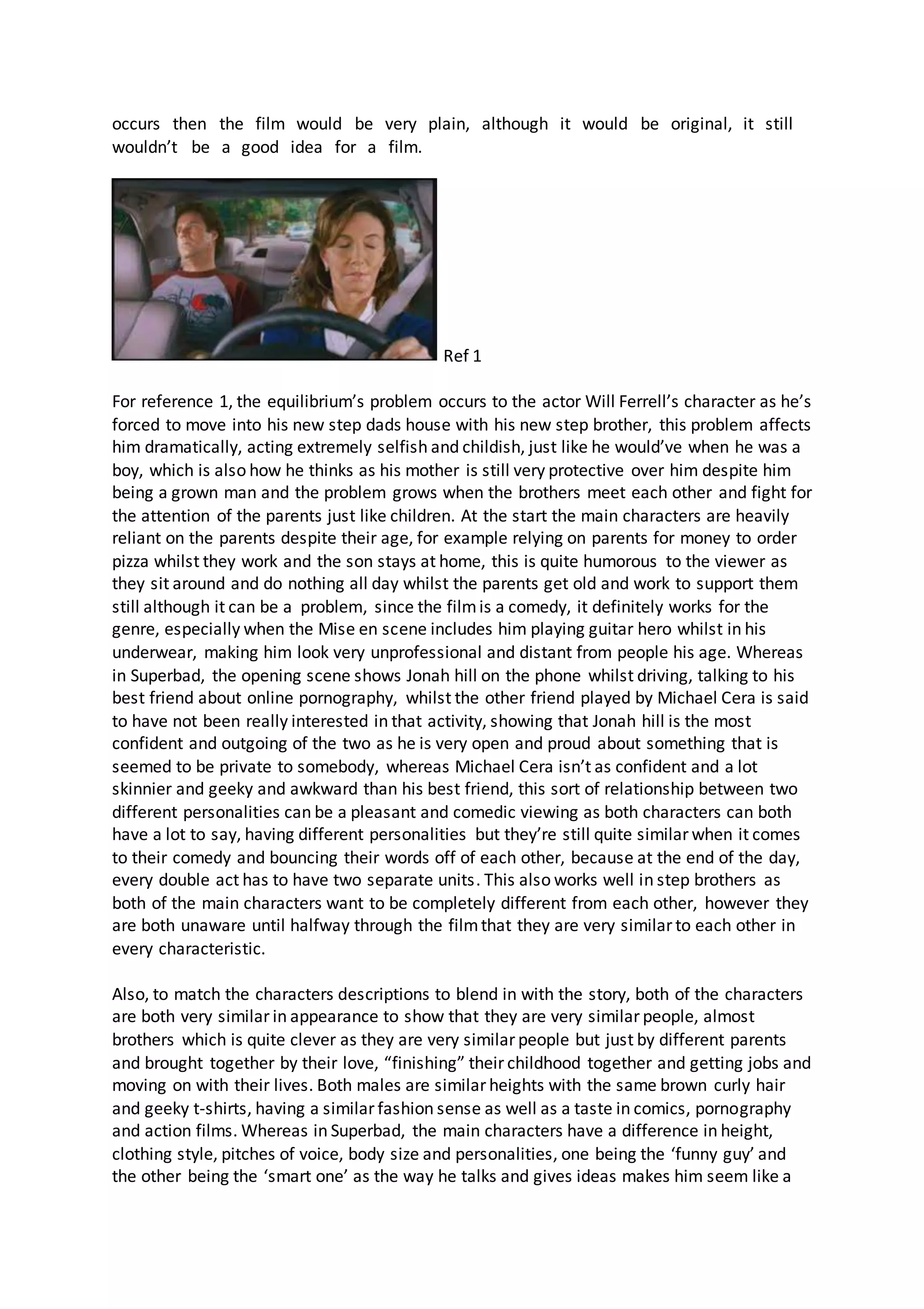 This document provides an analysis of the comedy films Step Brothers and Superbad, comparing their narrative and stylistic codes. It summarizes the plots of both films and analyzes how they follow the typical comedy narrative structure of introducing a problem, having characters work to resolve it, and achieving a happy ending. It also examines the similarities in characters' appearances and personalities between Step Brothers and the differences between the two main characters in Superbad. Finally, it discusses the use of medium shots, bright lighting, and focus on characters in both films to keep the pacing appropriate for comedy.