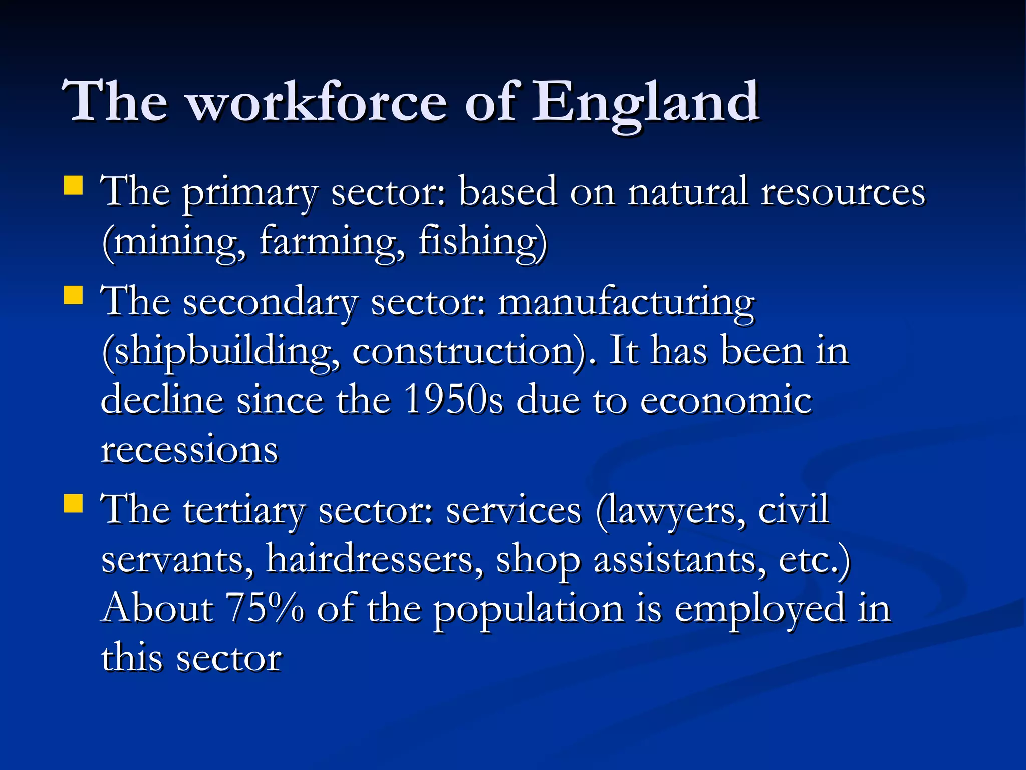 The document summarizes the workforce and education system in England. The workforce has shifted from primary industries like farming and mining to a tertiary service-based economy employing 75% of the population. Education in England includes nursery, primary, and secondary school, as well as higher education through universities, colleges, and vocational programs. Finding employment can be difficult, especially for unskilled workers and women with children. Pay varies significantly between industries, and women generally earn less than men.