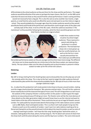 This document discusses marketing strategies for productions of the musical "Anything Goes" in two different contexts - a West End production in London and a school production. For the West End show, the target audience is described as older women who can afford theater tickets, and marketing would emphasize the 1930s setting through posters on buses and billboards in London showing costumes and characters. For the school production, the target audience is families of the students involved, and marketing would feature students in costumes on local posters and ads on local radio stations to promote the student-run aspects of the production.