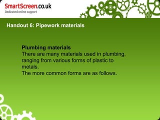 The document discusses common materials used for plumbing pipework, including various plastics like polythene, polyethylene, polypropylene, and UPVC as well as metals like copper and low-carbon steel. Plastics are used for external water and gas lines as well as waste pipes, and can be joined through mechanical joints, fusion welding, or push fit connections. Copper tubing comes in grades for bending or straight runs and is used for domestic water and gas. Low-carbon steel is more common for commercial and industrial installations due to strength over longer runs and comes in light, medium, and heavy grades.