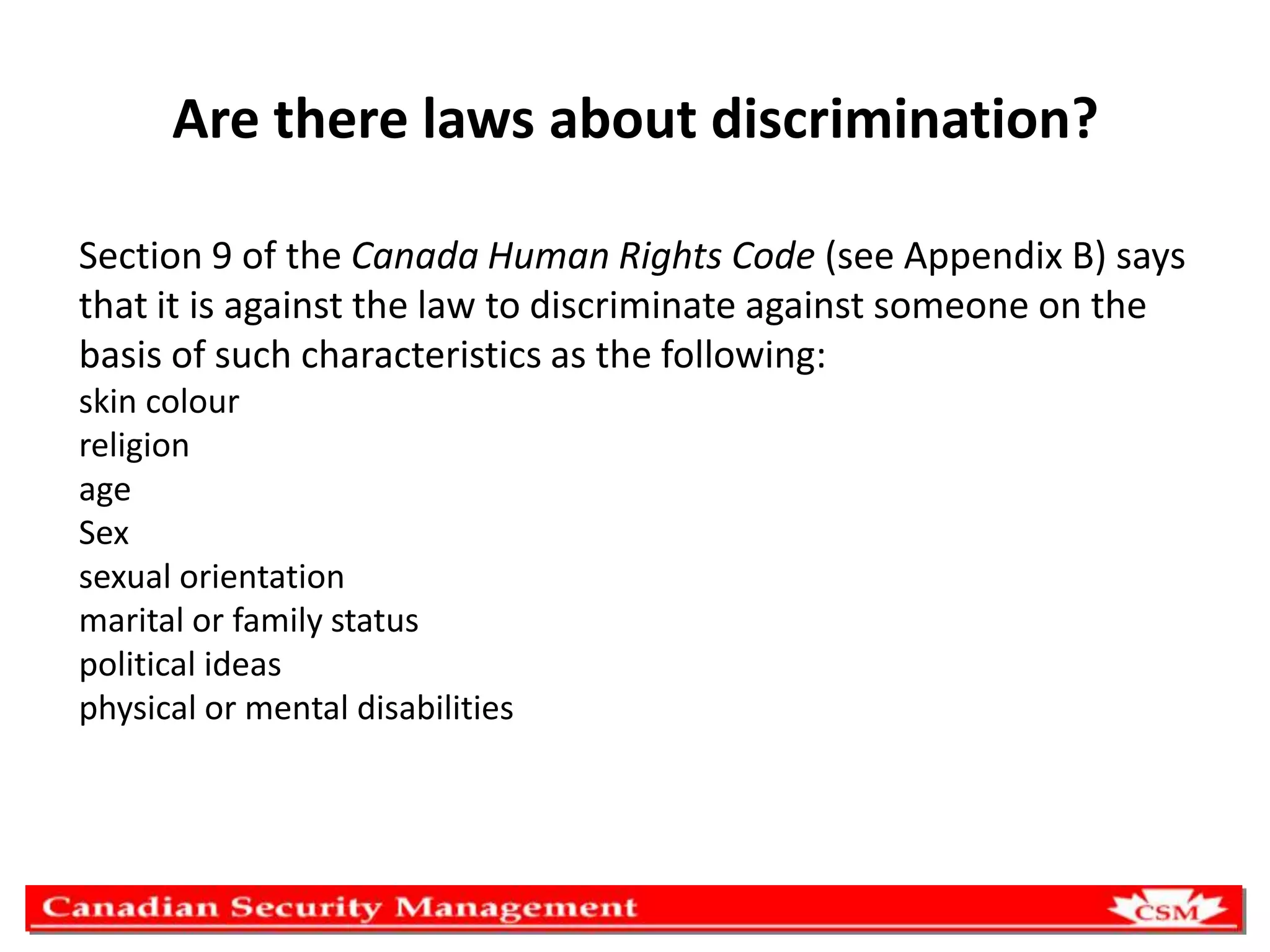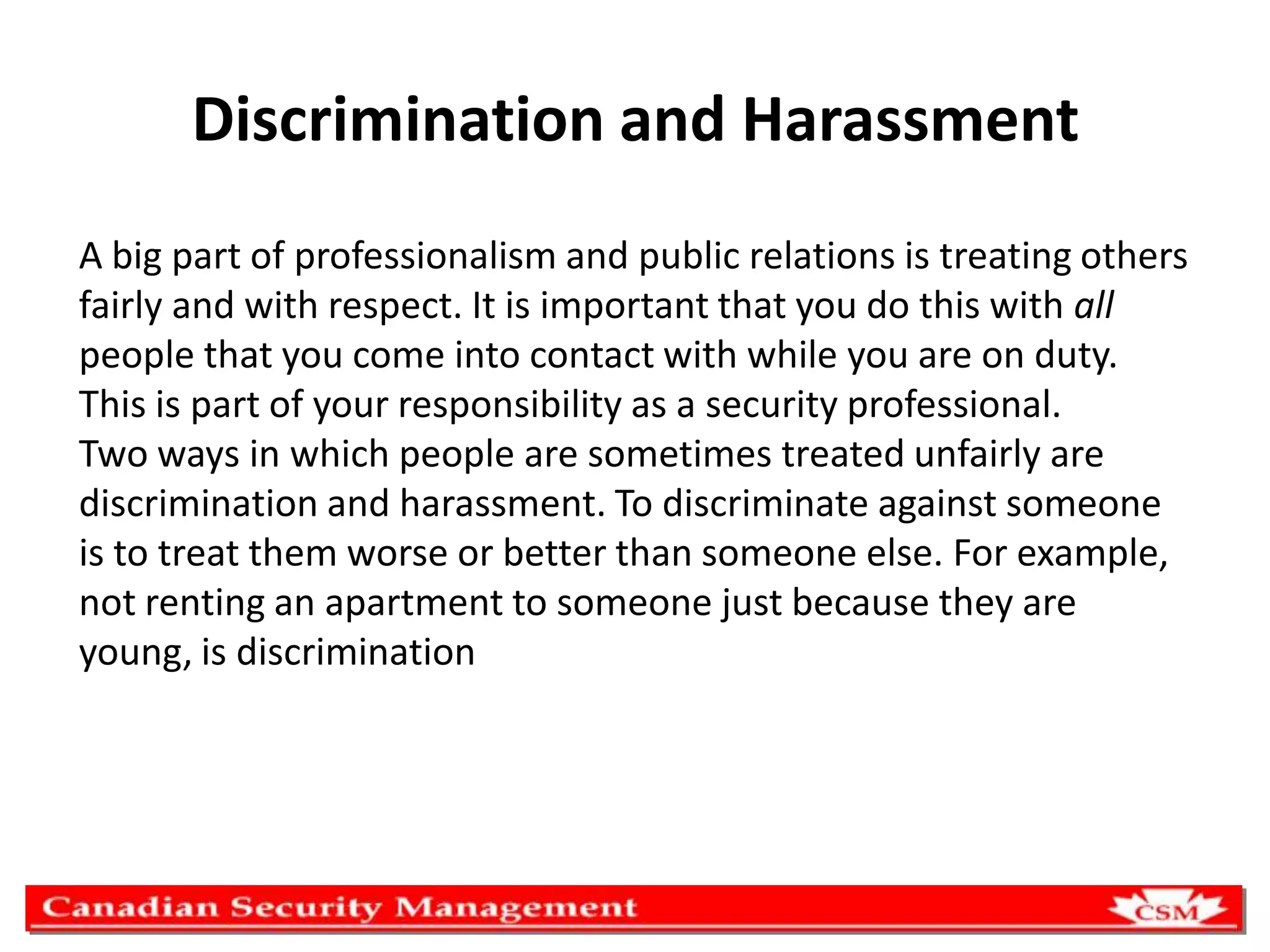 Discrimination and harassment violate professional standards and human rights laws. Discrimination involves unfairly treating someone worse due to characteristics like age, gender, or disability. Harassment involves offensive behavior or comments. If witnessing harassment, one should stop it if possible or report it, carefully documenting details. Stereotypes can lead to discrimination if not checked. Organizations should establish clear anti-harassment policies and procedures to address complaints in a confidential and impartial manner. All should aim to treat others respectfully regardless of personal attributes.