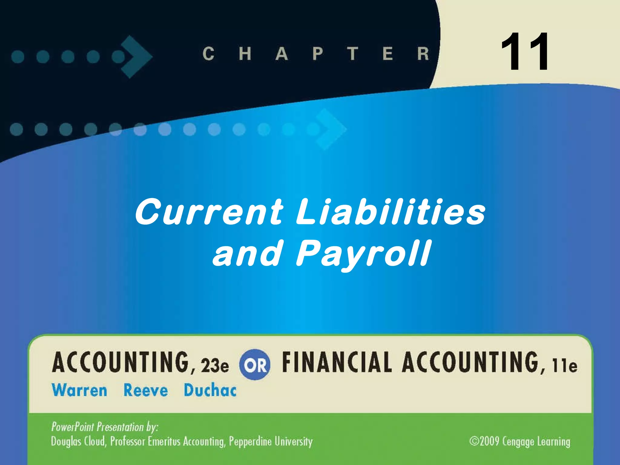 The document discusses current liabilities such as accounts payable, the current portion of long-term debt, and notes payable. It also describes contingent liabilities like product warranties. Companies estimate potential warranty costs based on past experience and record an expense and liability if the warranty obligations are probable and estimable. Journal entries are provided to record estimated warranty expenses and adjustments when warranty work is performed.
