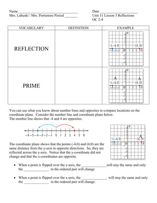 This document provides instructions on reflections across the x-axis and y-axis of the coordinate plane. It defines reflection as the mirror image produced by flipping a figure over a line. When reflecting a point across the y-axis, the y-coordinate stays the same and the x-coordinate changes sign. When reflecting across the x-axis, the x-coordinate stays the same and the y-coordinate changes sign. Examples are given of reflecting points across the axes and finding the new coordinates. Practice problems are also provided to have students name the reflected points for given coordinates.