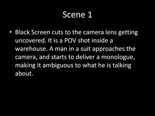 The document outlines an 11-scene, 5-7 minute short film. In the first scene, a man delivers a monologue to a camera in a warehouse. Scene 2 shows an awkward family dinner. In scene 3, the father loses money gambling online and breaks his laptop in frustration. Scene 4 returns to the warehouse, where the father is duct taped to a chair as the man who loaned him money demands repayment. Scene 5 has the father promise to repay his debt. Scene 6 ends with the man shooting the father in the chest. Scenes 7-9 depict the father's experience in purgatory, reflecting on past arguments and losses, before scene 10 shows the thugs collecting his body as the loan