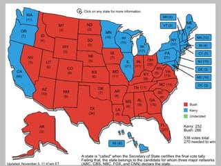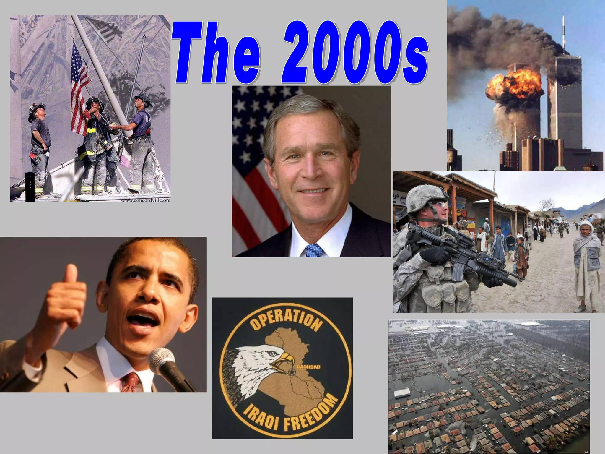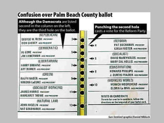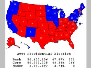 The document summarizes key events and people from US politics in the 2000s. It discusses the 2000 presidential election between Al Gore and George W. Bush. It also mentions the Supreme Court nominations under Bush and Obama, as well as the 2007 surge of US troops to Iraq under Bush and its reported success in reducing violence.