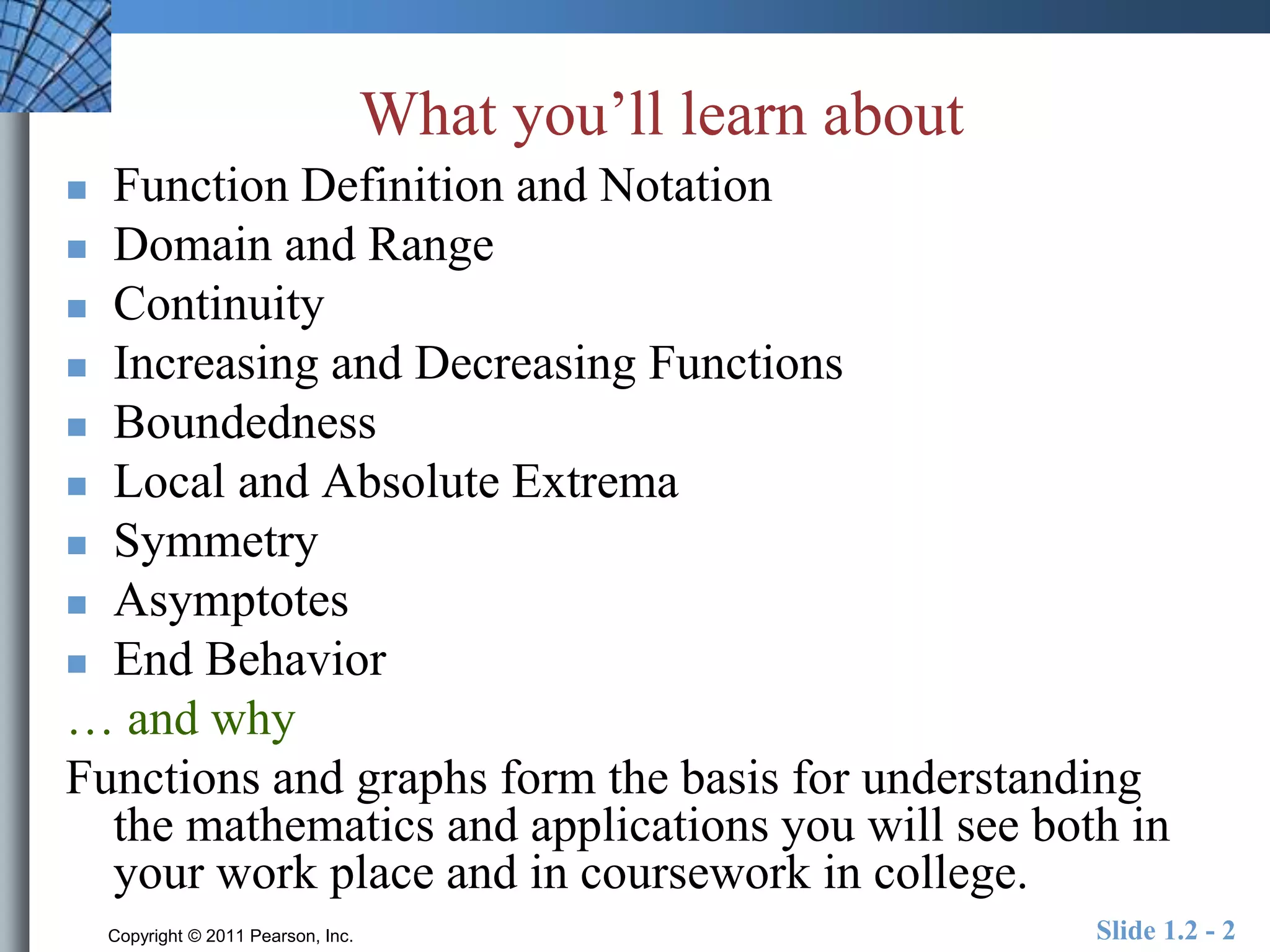 This document provides an overview of key concepts related to functions and their properties. It discusses function definition and notation, domain and range, continuity, increasing and decreasing functions, boundedness, local and absolute extrema, symmetry, asymptotes, and end behavior. Examples are provided to illustrate key concepts such as finding the domain and range of functions, identifying points of discontinuity, determining if a function is increasing or decreasing, and identifying local extrema. The document is intended to teach readers about important properties of functions.