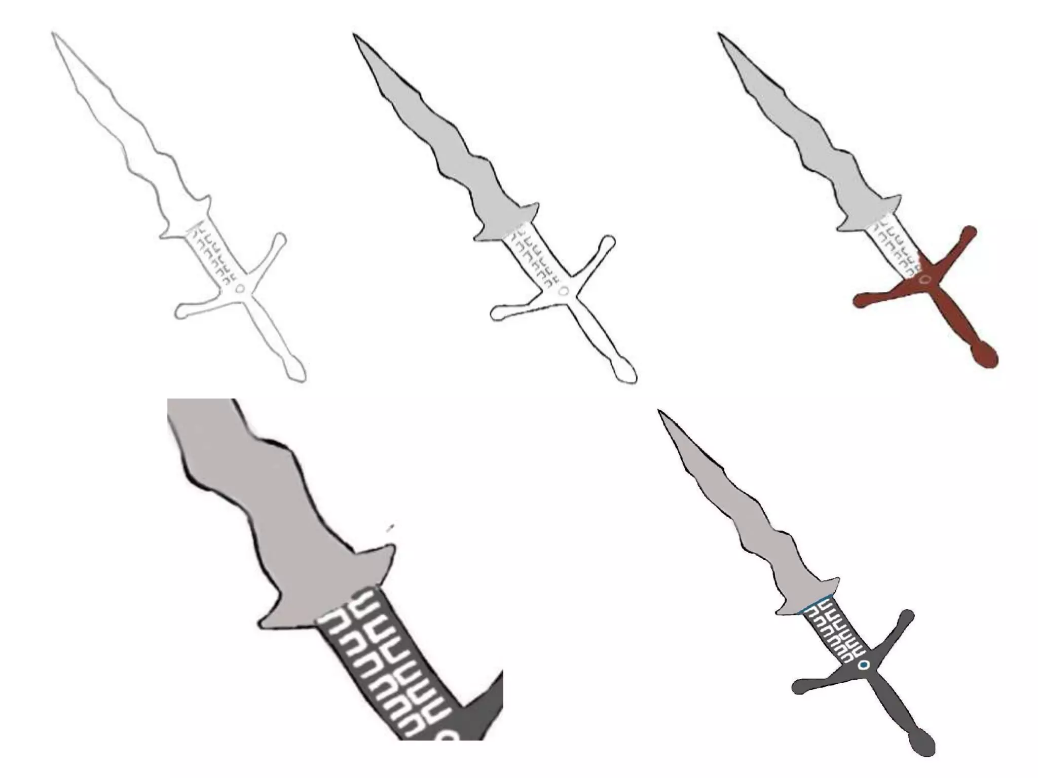 - Filling the blade with grey to look like steel and adding blue and white details.