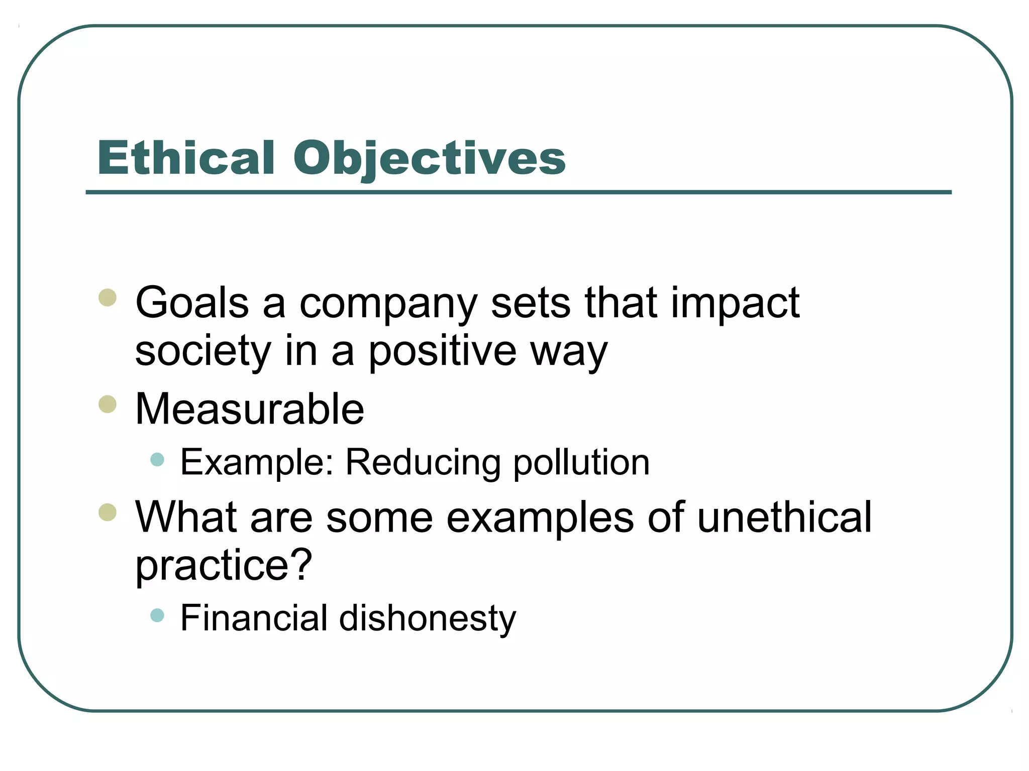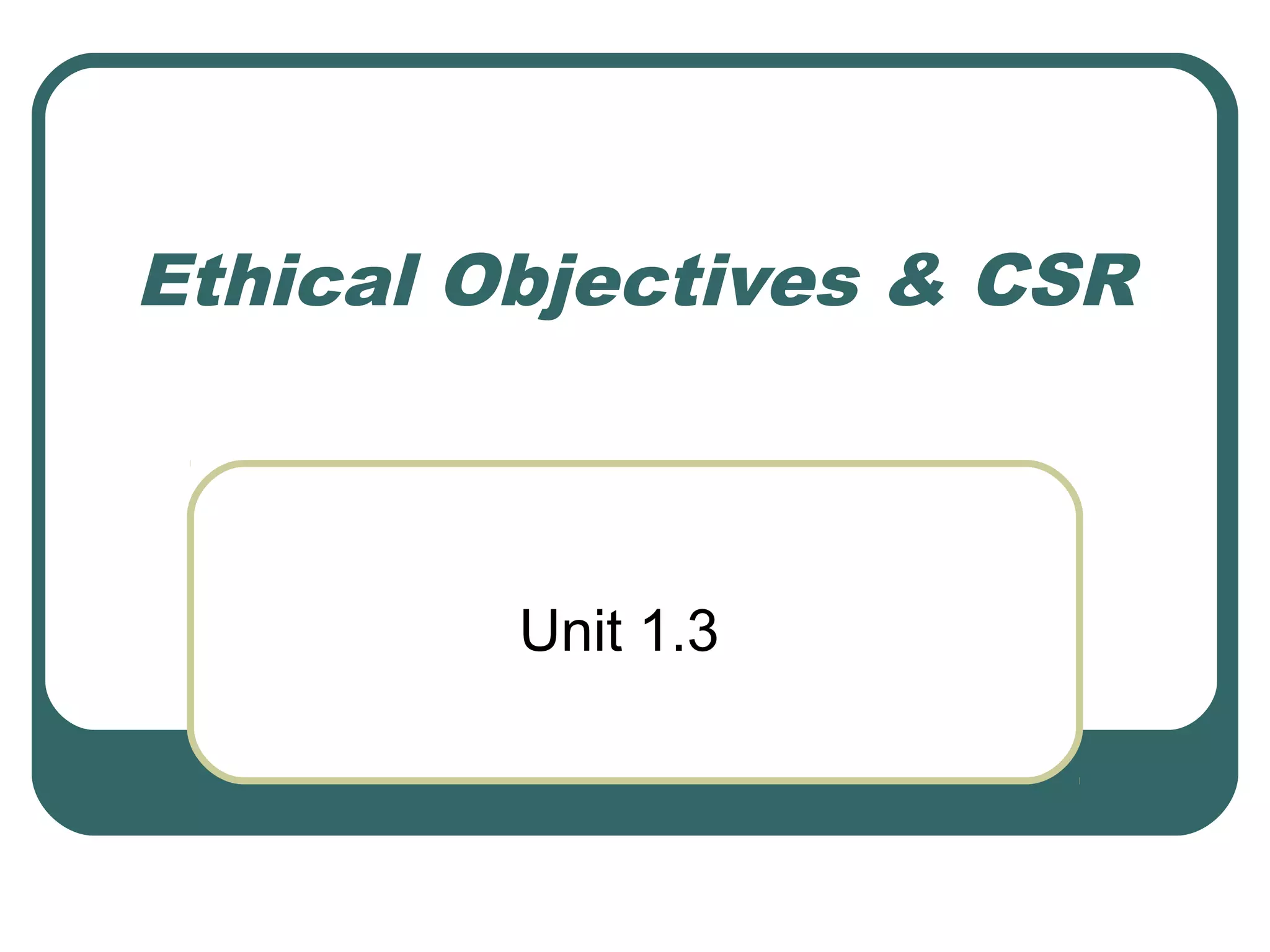 This document discusses ethical objectives and corporate social responsibility (CSR) for businesses. It defines ethical objectives as goals that positively impact society in a measurable way, like reducing pollution. It also examines the benefits of being ethical for a business's image, customer loyalty, costs, and staff motivation. The document then defines CSR as businesses acting morally towards stakeholders and explores different views on whether corporations have a responsibility to society and the extent they implement CSR initiatives based on pressures, perceptions, objectives, and costs/profits. It concludes by discussing how a social or environmental audit can provide marketing opportunities but be costly.