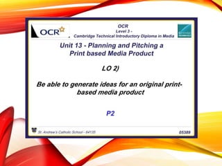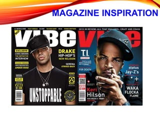 The document provides details about planning a new hip hop magazine, including color schemes, price, target audience, frequency of release, cover images, branding, and font styles. The target audience will be 16-25 year olds. The magazine will be released monthly and priced at £2.99. The cover will feature up-and-coming artists to attract readers. The brand identity and font styles were selected to fit with the hip hop genre.