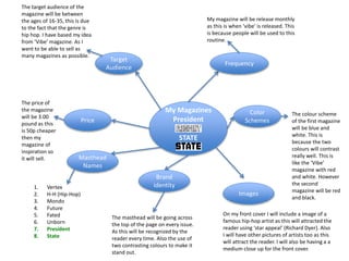 The document outlines plans for two hip-hop magazines called "President" and "STATE". Key details include: